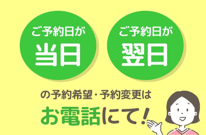 また、お痛みなどで当日または翌日のご予約をご希望される場合、当日や翌日のご予約を変更される場合は、お電話でのご連絡をお願いいたします。